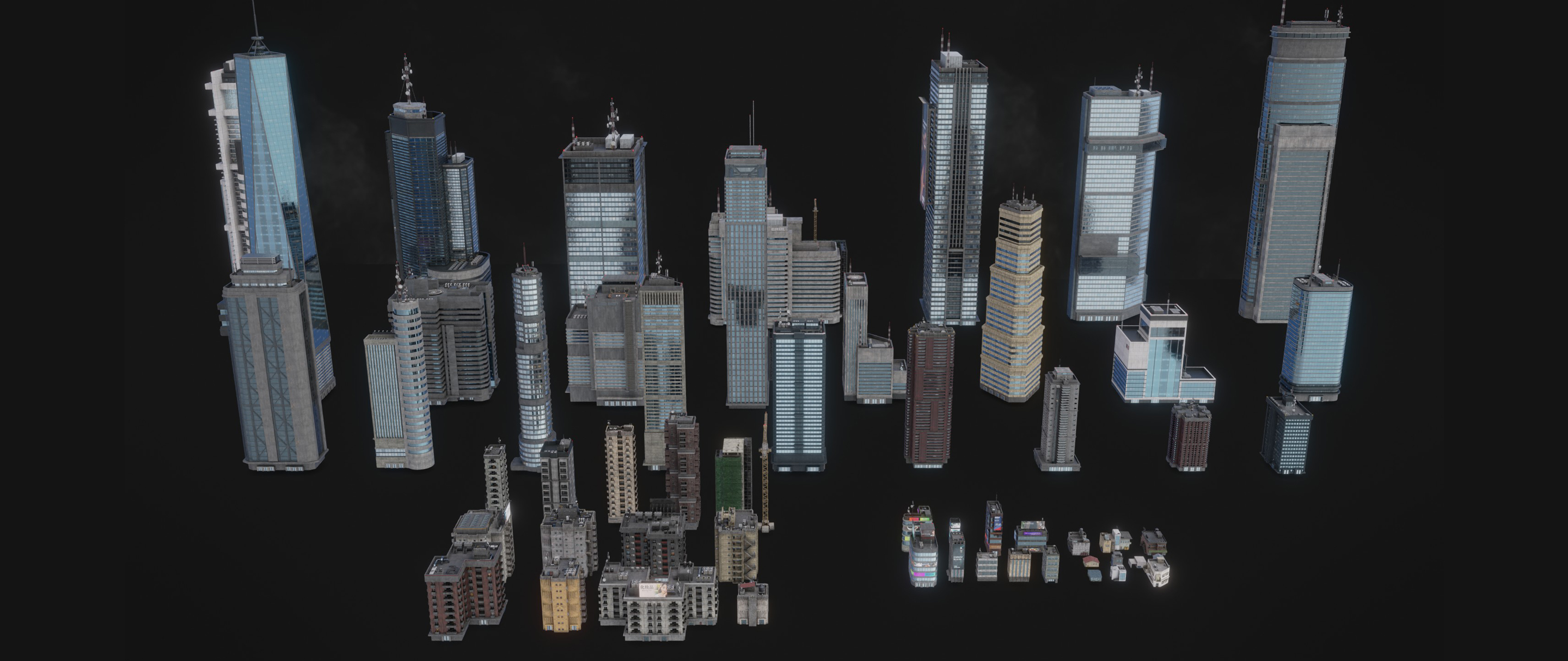 Take your creative modern metropolis projects to the next level with the Modern Cities Buildings Asset Pack.. This comprehensive pack includes a wide variety of high-quality 3D models of modern city buildings, from skyscrapers to apartment complexes to office buildings. All of the models are PBR-textured and come with multiple materials and textures.The pack includes a variety of different building types, so you can create a diverse and interesting cityscape.